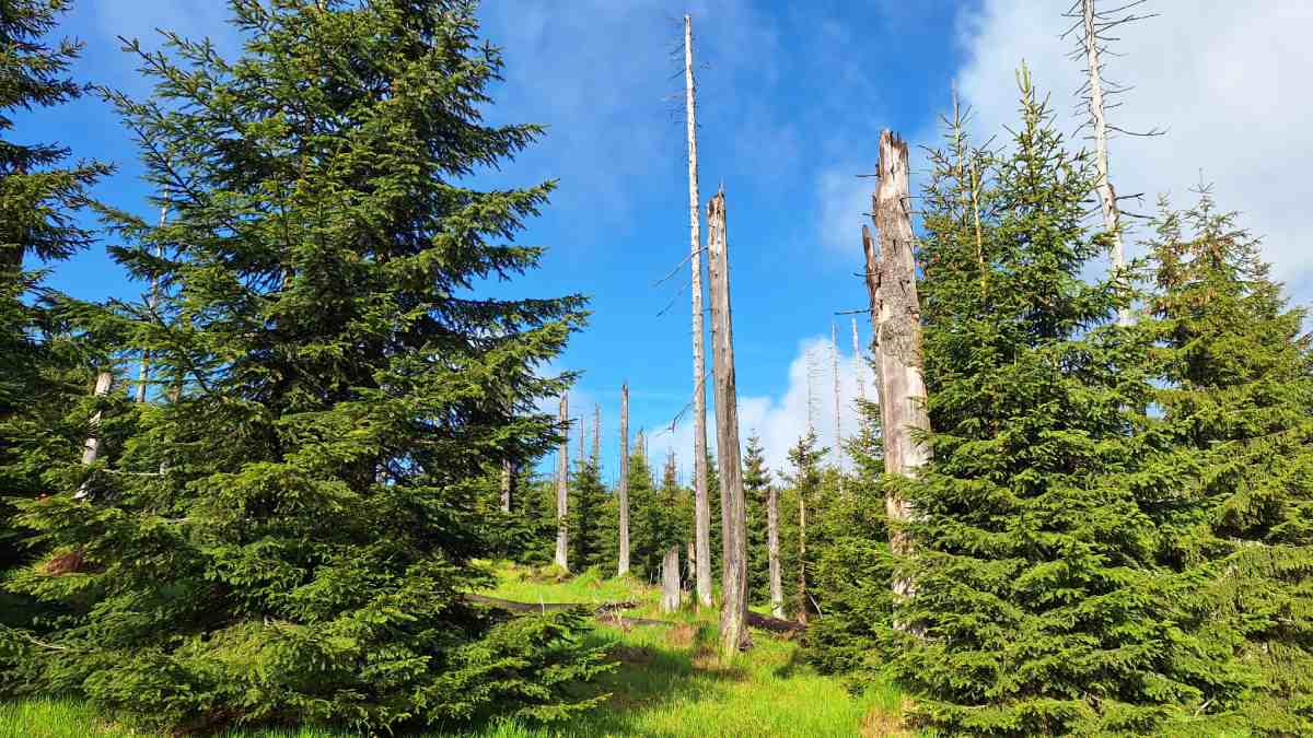 Smrky rovněž nečekaně rychle rostou. „Dnes zde najdeme nejčastěji smrky vysoké tři až deset metrů, ale některé z nich se doslova utrhly okolnímu pelotonu a jejich výška překračuje patnáct metrů a tloušťka kmene dosahuje až čtyřiceti centimetrů. Dorostly tak téměř dimenzí většiny smrků, které odumřely při kůrovcové gradaci před třiceti lety.“