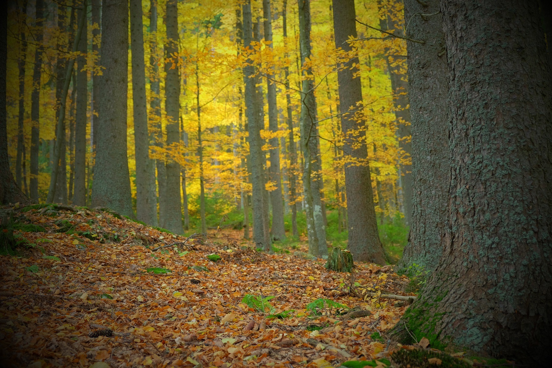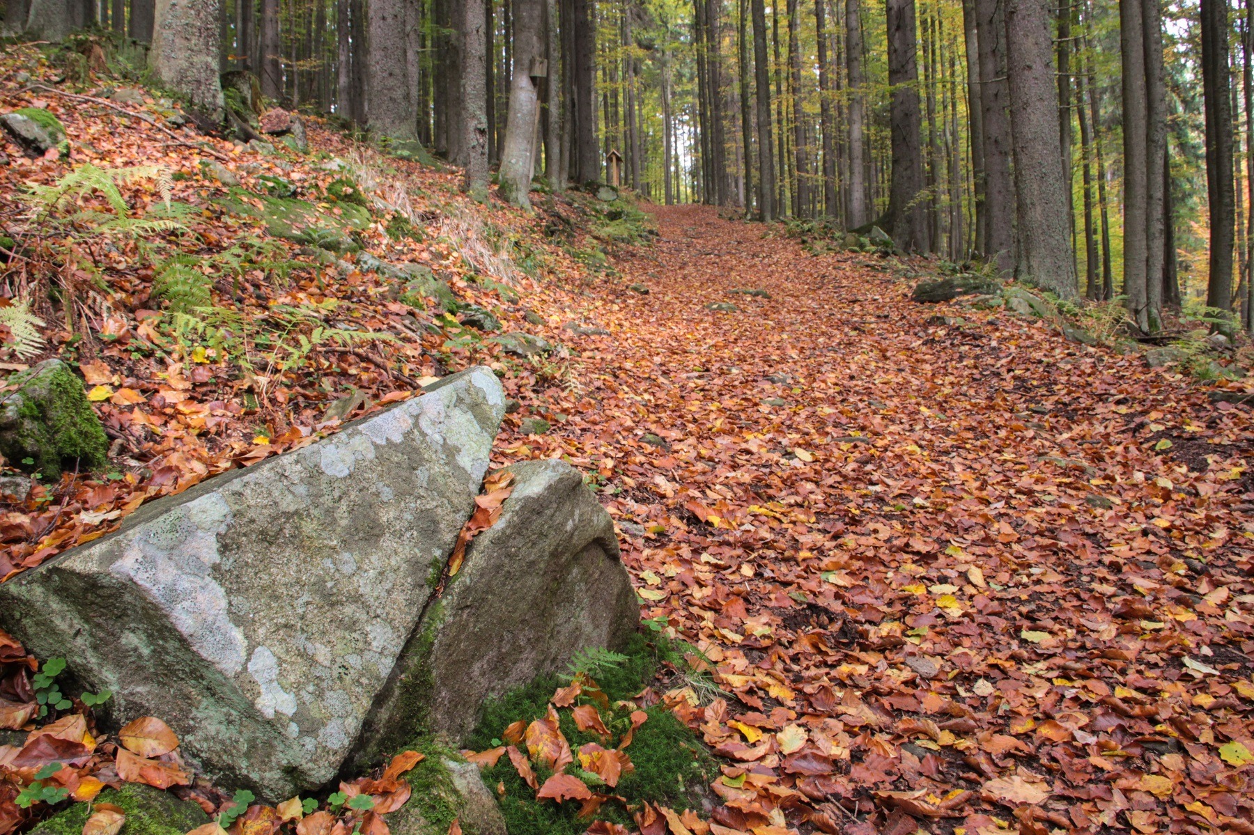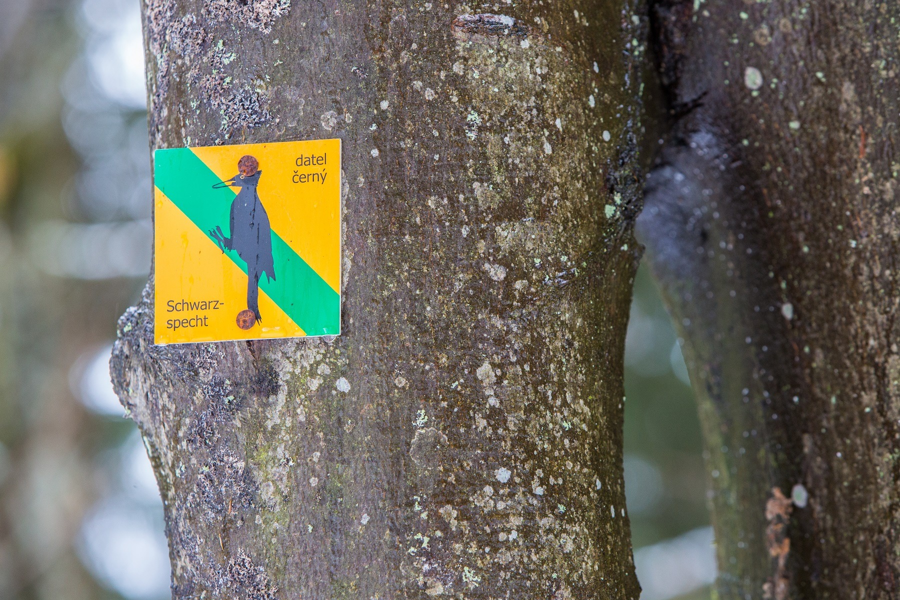 Der Pfad beginnt auf dem Waldweg links zwischen Borová Lada und Svinná Lada. Unser Reiseführer ist der Schwarzspecht – ein typischer Bewohner dieses natürlichen Waldes.