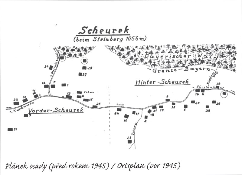 1775 wurden die ersten sechs Häuser gebaut. Das Dorf erstreckte sich später über 3,5 Kilometer und bestand auch aus Vorder- und Hinterscheuereck. Es wurden unterschiedliche Dialekte gesprochen, denn die Vorderscheuerecker Siedler stammten aus dem österreichischen Böhmerwald, die Hinterscheuerecker kamen vor allem aus dem Bistum Passau. Auf dem kargen Boden wuchs nur wenig. So mussten die Leute ihr Vieh oft wechseln, damit es nicht total verkam. 180 Menschen arbeiteten vor allem in den fürstlichen Wäldern. Im Winter erzeugten sie Holzschuhe, im Sommer sammelten und verkauften sie Waldfrüchte. Die Familie von Habelsberger war besonders unternehmerisch. Emil stellte die beliebten Kracherl (Limonade) her, Hermann betrieb ein Gasthaus und eine Gemischtwarenhandlung. Es gab auch eine Schule und hiesiges Volk war sehr musikalisch. Die Blasmusik spielte auch in der Umgebung.