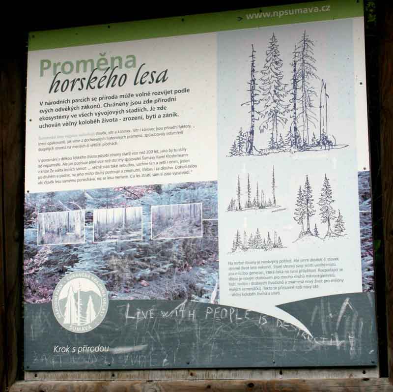 „V oblasti Jezerní hory nad Černým jezerem jsou umístěné tabule s informacemi o ochranném režimu zvláště chráněného území. Součástí je i piktogram zakazující vstup do území. Toto terénní značení bylo už několikrát poškozeno, nebo dokonce odcizeno,“ sděluje Ivo Procházka z Odboru Chráněné krajinné oblasti Šumava.