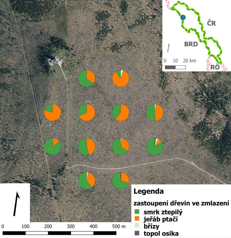 Přehledová mapka území s vyznačením polohy 12 monitoračních ploch a s vyznačením druhové skladby zmlazení dřevin.