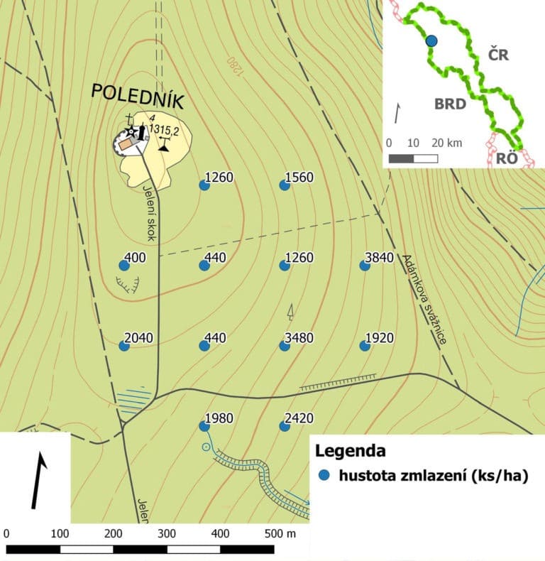 Přehledová mapka území s vyznačením polohy 12 monitoračních ploch a na nich zjištěných hustot přirozeného zmlazení (ks/ha).