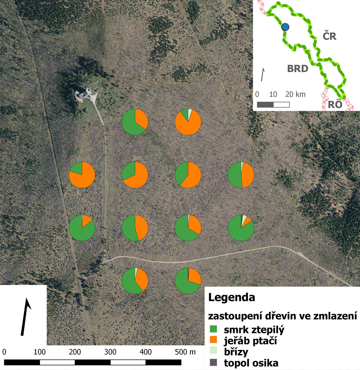- Ale roste tady nový smrkový les, který nikdo nesázel. Průměrná hustota všech malých stromků v omlazujícím se lese je 1750 ks/ha (pohybuje se od 400 do 3840 ks/ha). Přitom hustota mladých smrků je 1040 ks/ha, ale není všude stejná, zmlazení tvoří shluky, takže se hustota mladých smrků pohybuje od 80 ks/ha do 2300 ks/ha. Je jich tady více než smrků, které odumřely před 10 lety. Těch rostlo kolem 500 na hektaru, a také nebyla jejich hustota všude stejná.