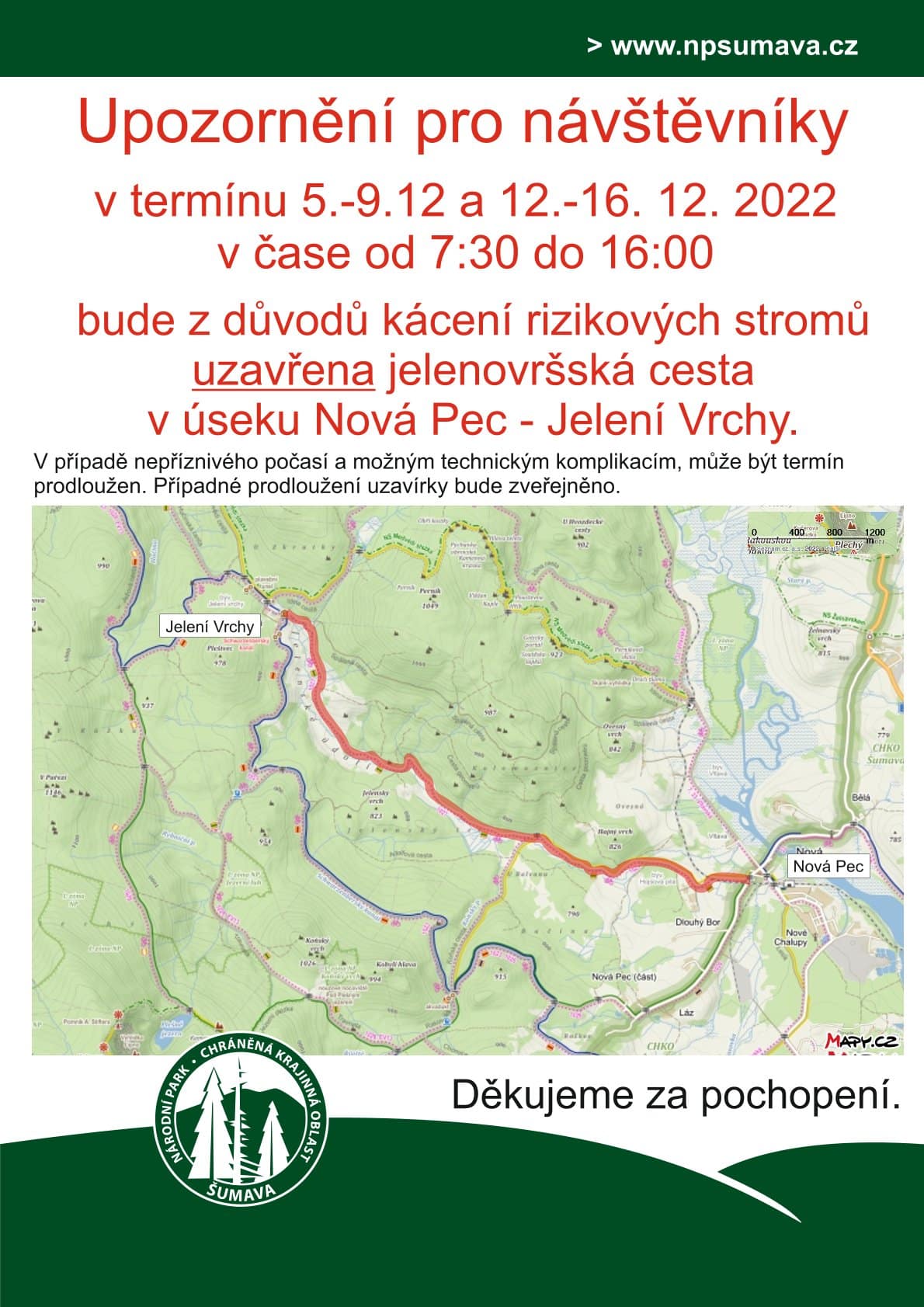 Aktuálně je v čase od 8:30 do 16:00 z důvodu kácení rizikových stromů uzavřena jelenovršská cesta v úseku Nová Pec – Jelení Vrchy.