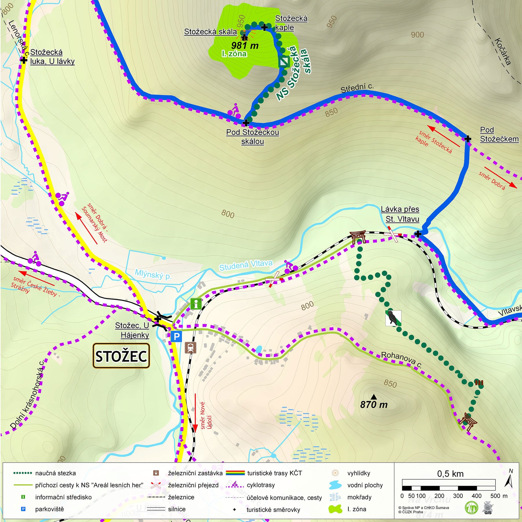 Samotná zážitková stezka začíná cca 1 km od informačního střediska, je 1,6 km dlouhá a vrací se zpět do obce Stožec. Celý okruh má délku 4,5 km.