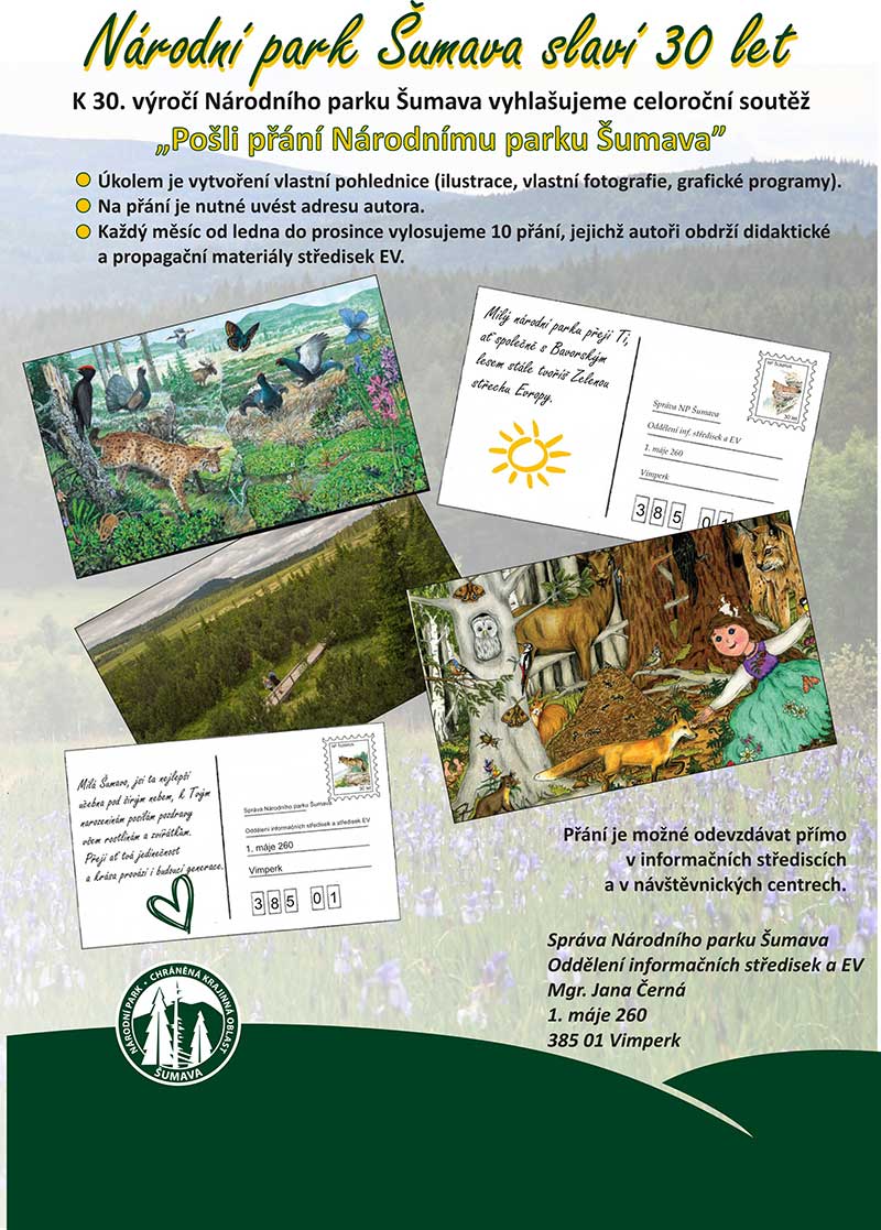 U příležitosti 30 let Národního parku Šumava vyhlašují střediska environmentální výchovy Správy NP Šumava celoroční soutěž „Pošli přání Národnímu parku Šumava“.