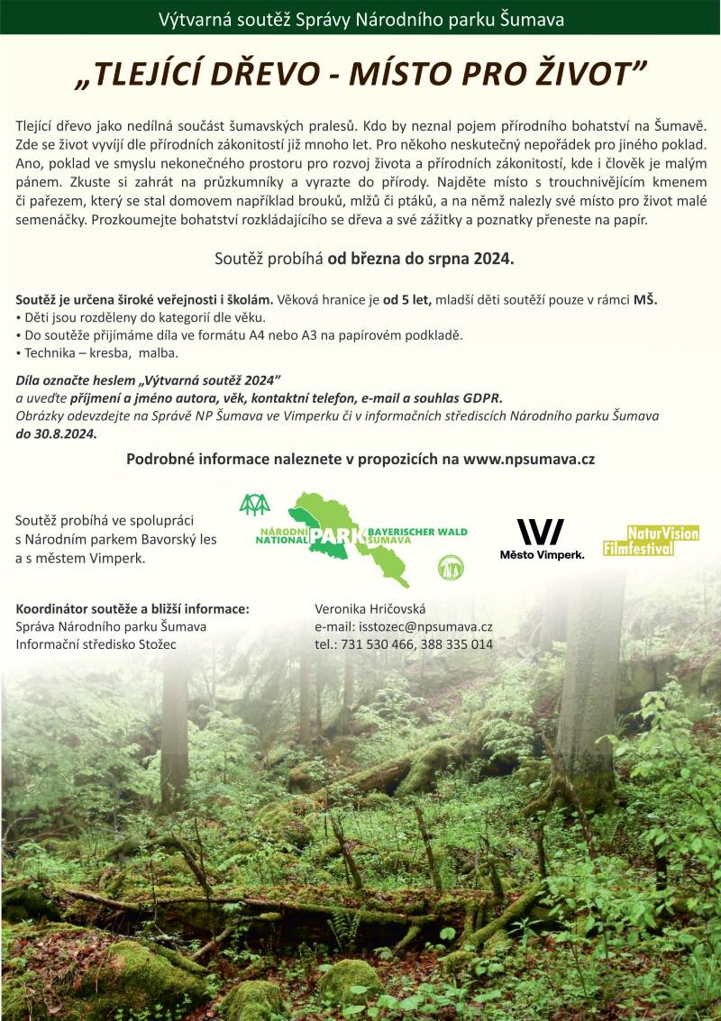 Tlející dřevo jako nedílná součást šumavských pralesů. Kdo by neznal pojem přírodního bohatství na Šumavě. Zde se život vyvíjí dle přírodních zákonitostí již mnoho let. Pro někoho neskutečný nepořádek pro jiného poklad. Ano, poklad ve smyslu nekonečného prostoru pro rozvoj života a přírodních zákonitostí, kde je i člověk malým pánem. Zkuste si zahrát na průzkumníky a vyrazte do přírody. Najděte místo s trouchnivějícím kmenem či pařezem, který se stal domovem například brouků, mlžů či ptáků, a na němž nalezly své místo pro život malé semenáčky. Prozkoumejte bohatství rozkládajícího se dřeva a své zážitky a poznatky přeneste na papír.