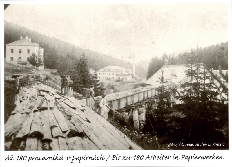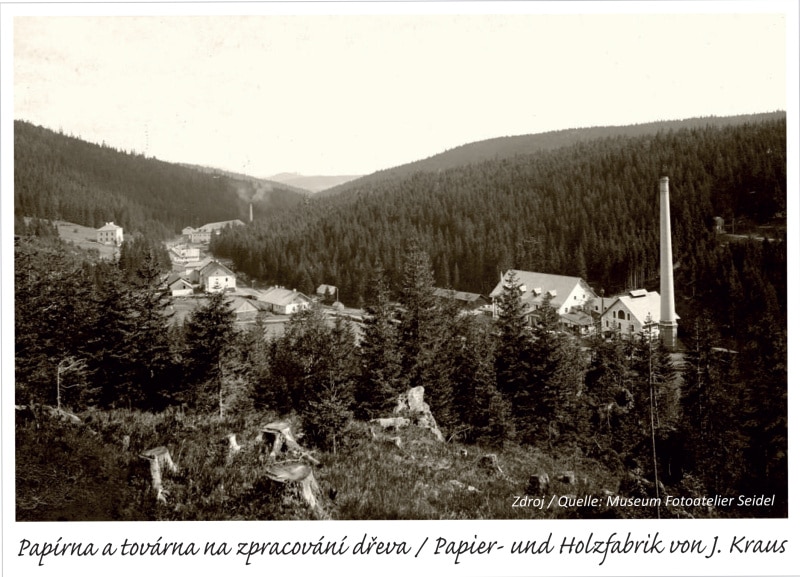 V době velké sklářské krize v roce 1887 zdejší sklárna zaniká. O osm let později zde Jakub Kraus začíná s papírenskou výrobou. Kraus staví i nové budovy, na Vltavě pak dvě vodní elektrárny, jejichž elektřina slouží k pohonu papírenských strojů.