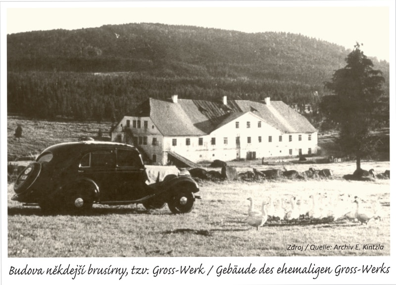 Nejblíže k silnici stávala brusírna zrcadlového skla zvaná Gross-Werke. Brousící stroje byly poháněny pomocí vodních kol, na která dopadala voda vedená náhonem a vantroky ze Slatinného potoka.