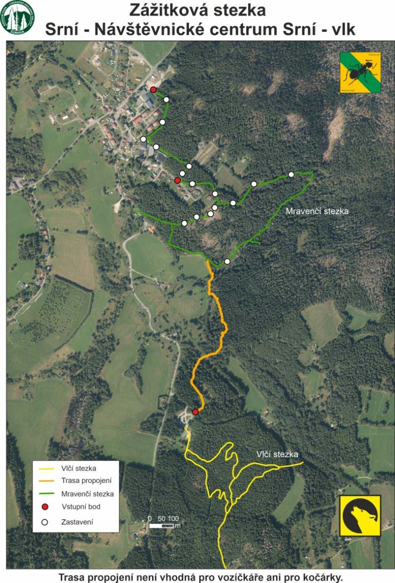 Nástupními místy ve směru ze Srní jsou vstupy na stávající Mravenčí stezku. Jeden vstup je z parkoviště u benzinové čerpací stanice. Od zastávky autobusu je vyznačen směr k druhému vstupu za hotelem. Z Mravenčí stezky lidé sejdou podle dřevěných ukazatelů a žlutých značek na Vlčí stezku přes Hrádecký potok a dále pak do lesa směrem k návštěvnickému centru.