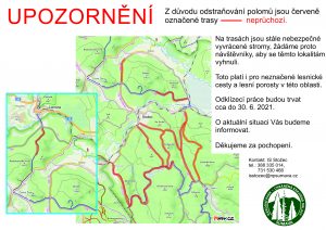 – aktuálně nepřístupné trasy v okolí Stožce a Lenory. Některé trasy sice mohou být už prořezané, ale v jejich těsné blízkosti se zpracovávají nebezpečné vyvrácené stromy. Není zde tedy možné z bezpečnostích důvodů projít.