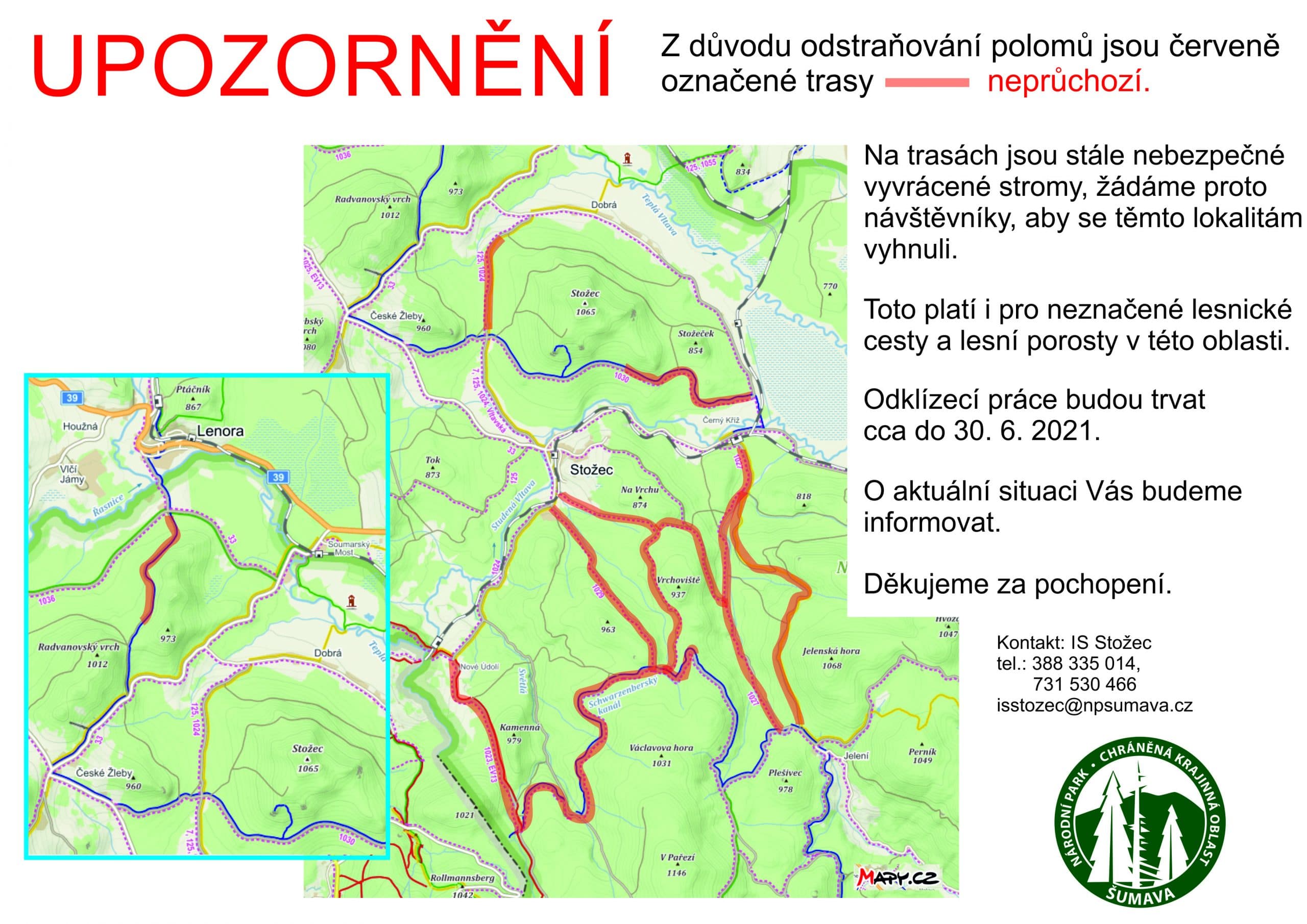– aktuálně nepřístupné trasy v okolí Stožce a Lenory. Některé trasy sice mohou být už prořezané, ale v jejich těsné blízkosti se zpracovávají nebezpečné vyvrácené stromy. Není zde tedy možné z bezpečnostích důvodů projít.