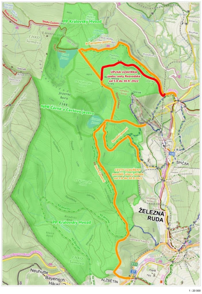 Protože jde o turistickou oblast, Městský úřad Klatovy zakázal veřejnosti na podnět Lesů ČR vstup na cesty a do porostů, a to od 5. srpna do 30. září, vždy od pondělí do středy.