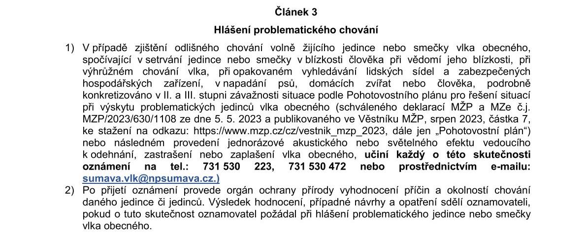 Orgán ochrany přírody tímto opatřením obecné povahy upravuje postup činností a předání informací o závadovém chování problematických jedinců zvláště chráněného vlka obecného (Canis lupus);...
