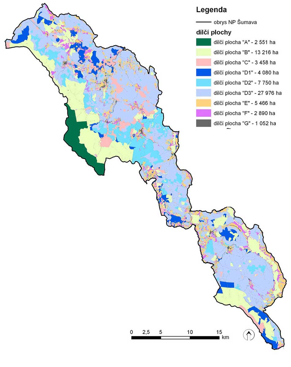 Vymezují v NP Šumava prostorově i managementově území ponechané samovolnému vývoji. Jsou vymezeny za účelem naplnění prvků ekosystémové ochrany v NPŠ a v návaznosti na sousední Národní park Bavorský les. Dílčí plochou „A“ je označeno území ponechané samovolnému vývoji bez přímých zásahů proti vlivu zvěře. Vyskytuje se při hranici s Národním parkem Bavorský les. Dílčí plochou „B“ je označeno území ponechané samovolnému vývoji s přímými zásahy proti vlivu zvěře. Lokalizace a rozloha dílčí plochy B odráží potřebu ekosystémové ochrany v NPŠ s přihlédnutím k místním specifikům (např. rozloha a tvar území NPŠ, způsob regulace početnosti zvěře, aktivní management území v minulosti). K zetlení je ponecháváno 100 % veškeré hmoty (včetně hmoty asanované v minulosti a poražených nebezpečných stromů podél cest).Dílčí plocha“C“