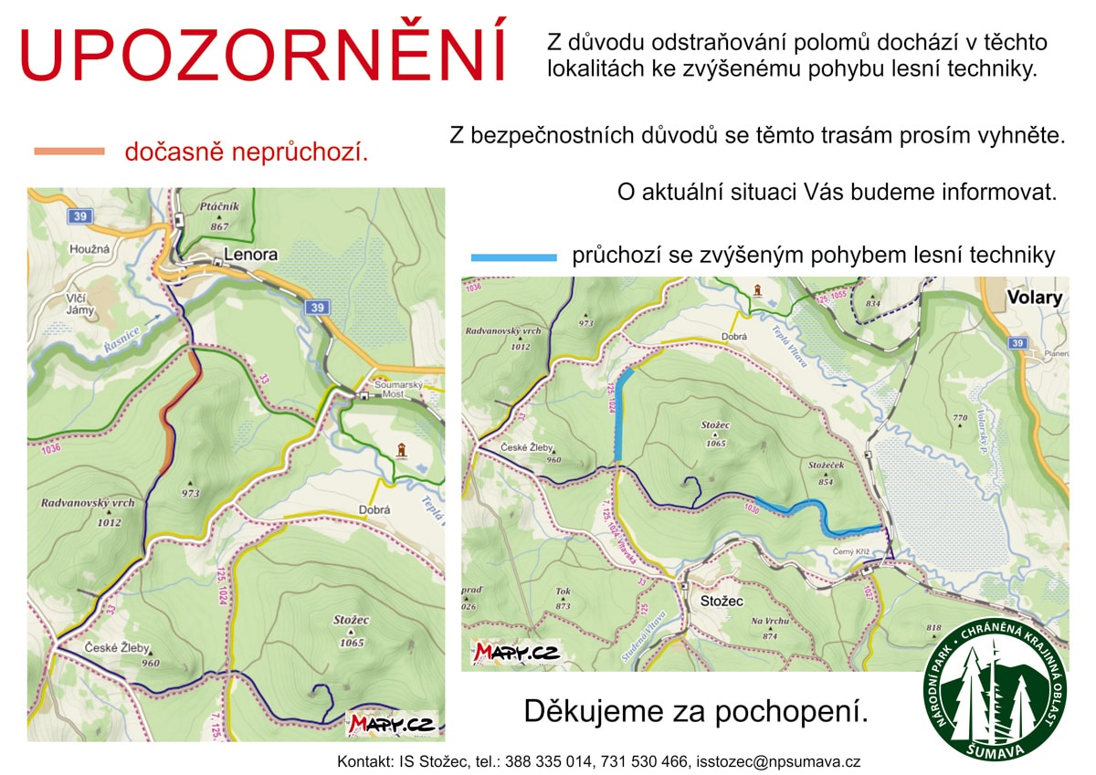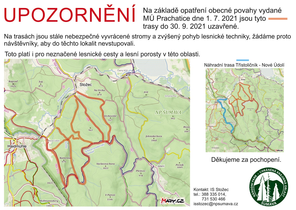 lesní cesta Schwarzenberský kanál od křižovatky s Jezerní cestou pod Plešným jezerem (Kamenná skládka) po Rosenauerovu nádrž nad Novým údolím a všechny přístupové cesty k tomuto úseku, tedy směrem od zmíněné křižovatky: lesní cesta Ministerka, Bonarova, Oslí, Ferdinandova, Jelení, Zelená, Ptačí a lesní cesta Trojmezná.