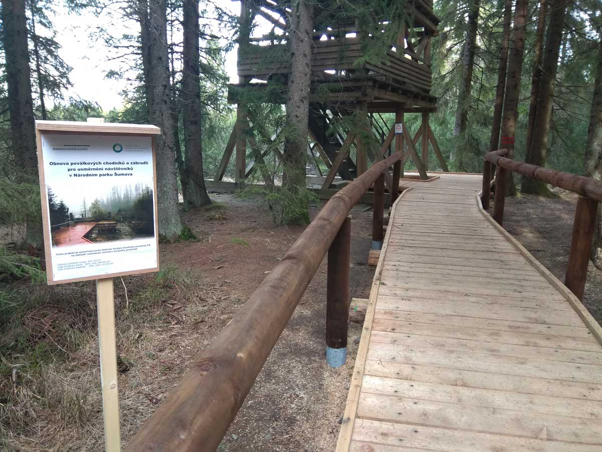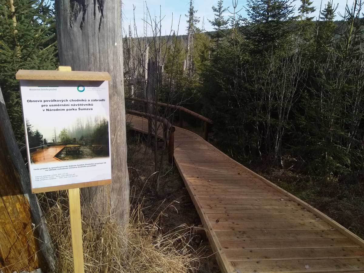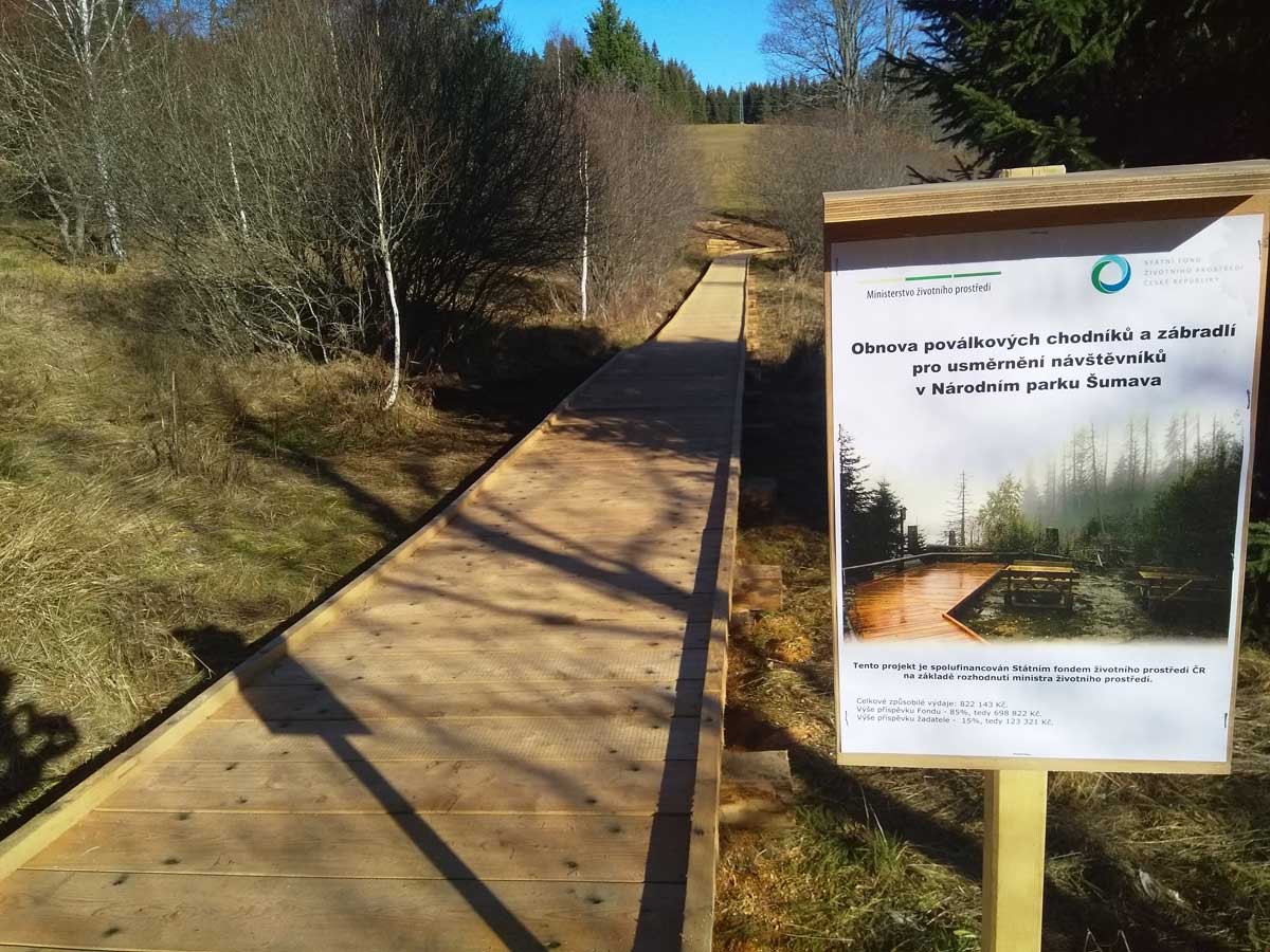 Obnova poválkových chodníků a zábradlí na 4 mimořádně cenných přírodních stanovištích. Jedná se o Jezerní slať, Prášilské jezero, Prameny Vltavy a oblast bývalé osady Vchynice-Tetov. Všechny lokality se nacházejí na území Národního parku Šumava. Součástí realizace prací byla úprava vyrovnání plochy pod vyrovnávací povaly na rostlém terénu. Veškeré dřevěné konstrukce z modřínového dřeva slouží k zajištění vyšší trvanlivosti materiálu bez nutnosti impregnace. Celková obnova 145 m poválkových chodníků. Obnova stávajícího, již nevyhovujícího zábradlí ve 2 mimořádně cenných přírodních lokalitách – Pramenech Vltavy a Jezerní slati. Zábradlí bylo zhotoveno z dřevěných kuláčů ze smrkového impregnovaného dřeva. Celková obnova 255 m zábradlí.