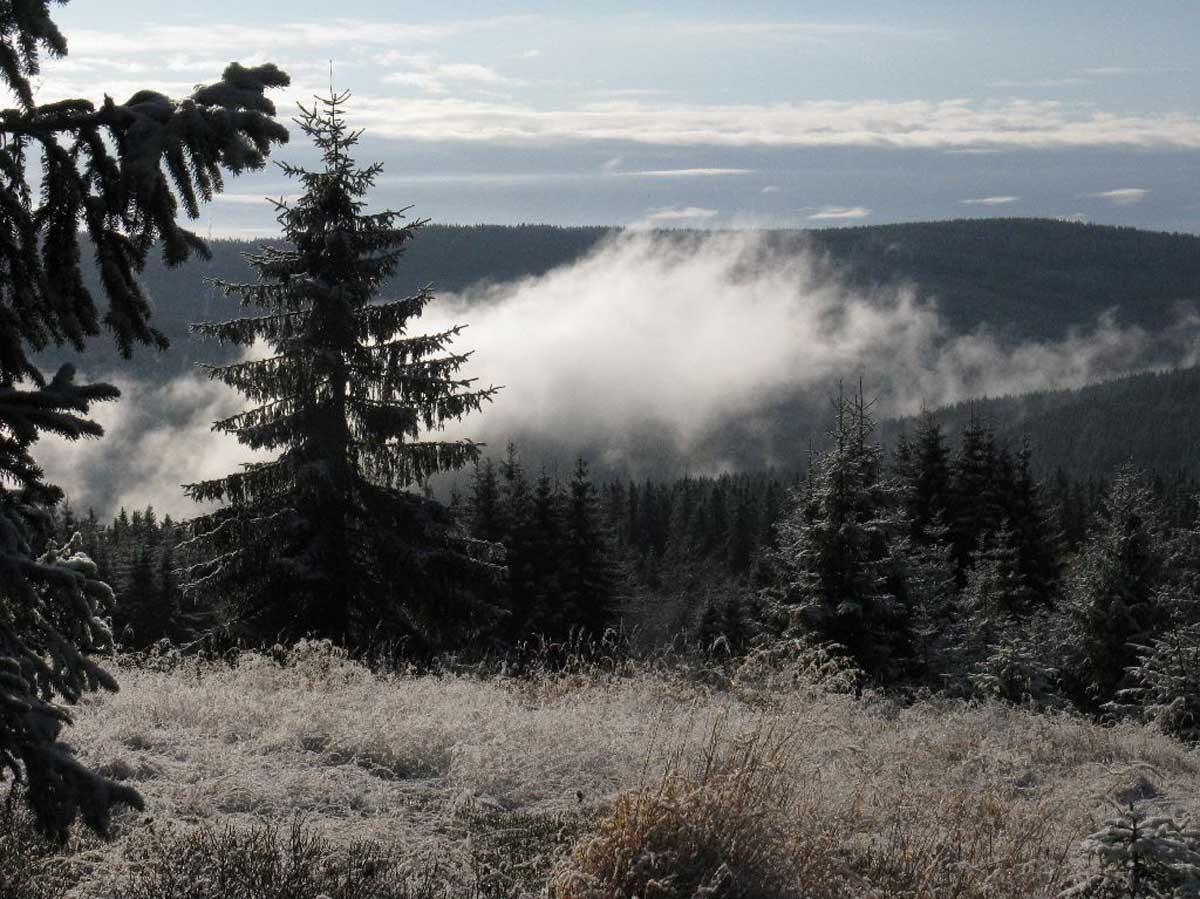 Směrem na Vysoké Lávky (žlutá TZT) a Formberg (zelená TZT) se skrz lesy navrátíme do Prášil.